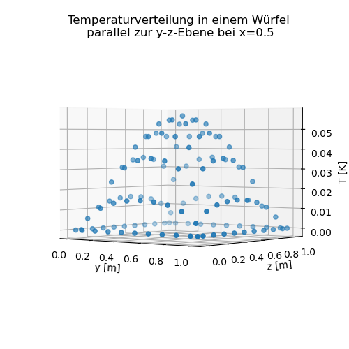 3d-Wärmeleitung stationär mit Dirichlet-Randbedingungen in den West-, Süd-, Nord-, unteren und oberen Rändern, im Osten mit Neuman-Randbedingung.